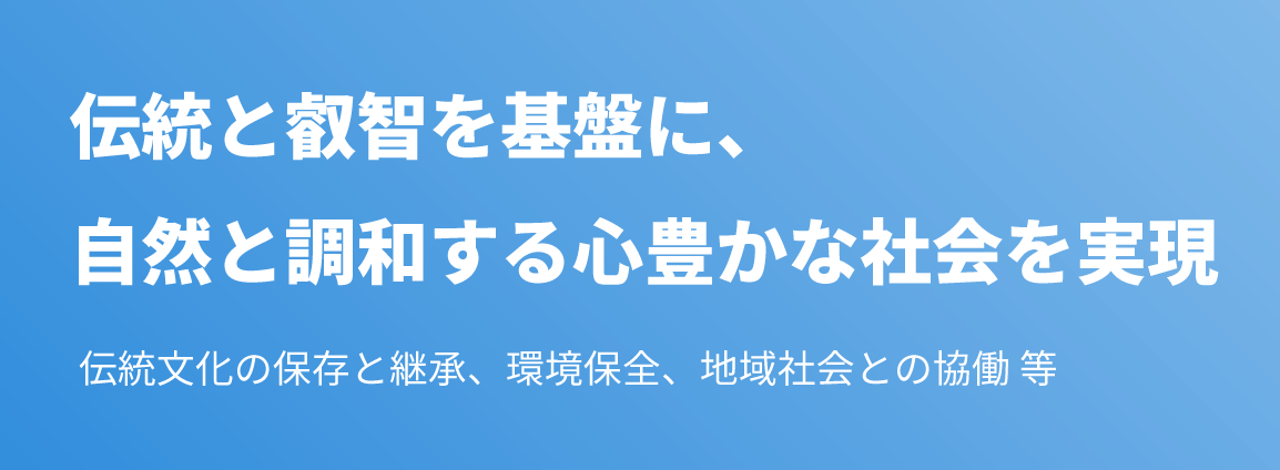 当法人は、伝統と叡智を基盤に、自然と調和する心豊かな社会の実現を目的とする。